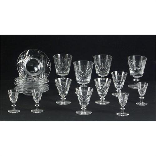 CRYSTAL: A lot of sixteen crystal pieces of ''Webb Corbett, Made in England'', hallmarks indicate these as made between 1930 and 1947. The set consists of four footed wine or water goblets 5.25'', 4 footed Claret or white wine glasses 3.75'', 4 port or sherry glasses 3.50'', 4 round ash trays 5.50'', the pattern is attributed to ''Westminster''. Note: Hallmark is on most pieces but not all.