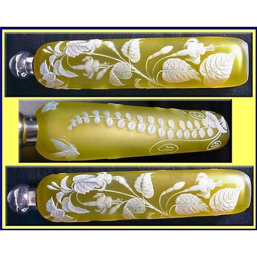 Flattened elongated oval form. Yellow glass with white overlay carved in magnificent fuchsia pattern with butterflies. Flowers in full bloom and in bud, and beautifully carved foliage. A number of butterflies flutter around the bottle. Round sterling silver cap. Original glass stopper. Gilt silver neck.