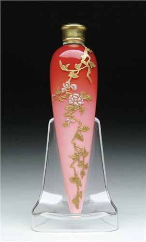 WEBB LAY DOWN SCENT BOTTLE.  Beautiful Webb lay down scent bottle features red cased glass shading to a pale pink with an enameled gold and white decoration of flower blossoms, leaves and branches and a gold butterfly.  Original metal cap.  SIZE:  6-1/2 in. l.  CONDITION:  Minor wear to gold enameling on butterfly, otherwise very good to excellent.  5-60273