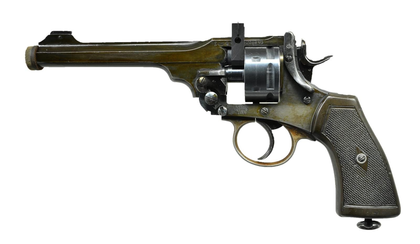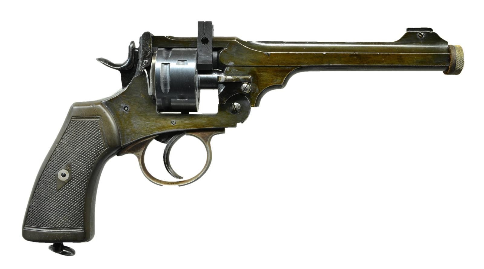 W/ 22 LR CONVERSION UNIT. Cal. 22 LR. S#317781. Bbl. 6". Bbl. has matching number. Left side of frame marked "WEBLEY/MARK IV/PATENT/1917". Top left of bbl. is marked "17" w/ broad arrow, British proofs & "MARK VI". No British sale proofs visible. Revolver is equipped w/ an unmarked 22 LR conversion kit that appears identical to Parker Hale kits. Kit has cylinder w/ bbl & adjustable rear sight. Checkered rubber grips. CONDITION: grips show some areas of flattened points w/ a large chip missing out of bottom of right panel and scattered handling wear. Cylinder retains strong original blue w/ back face worn to silver and operational residue on front face. Balance of metal has turned to a brown patina w/ a few areas of oxidation staining, some light dings & handling marks. Very good bore. (22-2424/MJC). MODERN. $500-800.