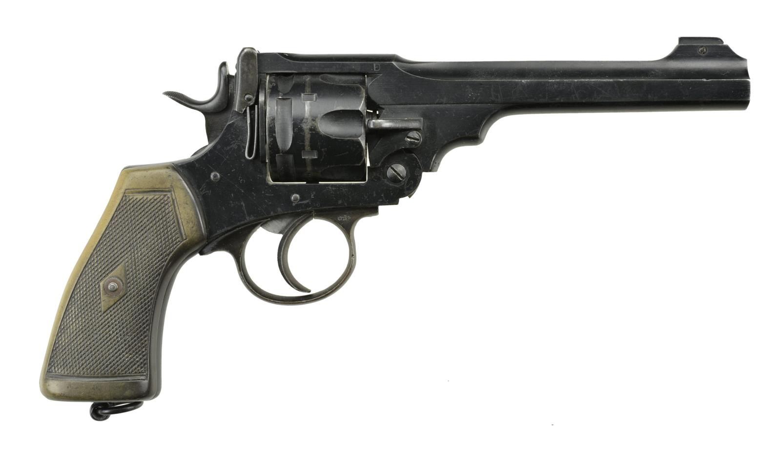 Cal. 455 Eley. S # 242586. Bbl. 6". All matching numbers. Left side of frame marked "WEBLEY/MARK VI/PATENTS/1916". British proof markings throughout but no visible sale proofs. Top right of bbl. marked "35" likely an arsenal overhaul marking. Top right of bbl. marked "D" w/out broad arrow. Cyl. S # is fully visible indicating original chambering. Checkered wooden grips. CONDITION: grips show scattered handling wear, light dings & scratches. Metal retains 85% arsenal reworked Suncorite paint finish w/ scattered flaking. Very good bore w/ light frosting. (22-2420/MJC). CURIO. $300-500.