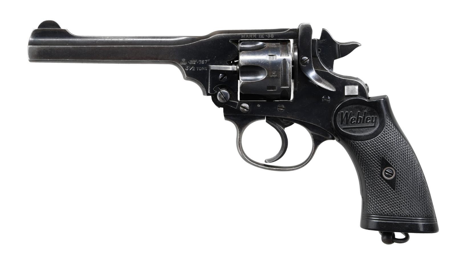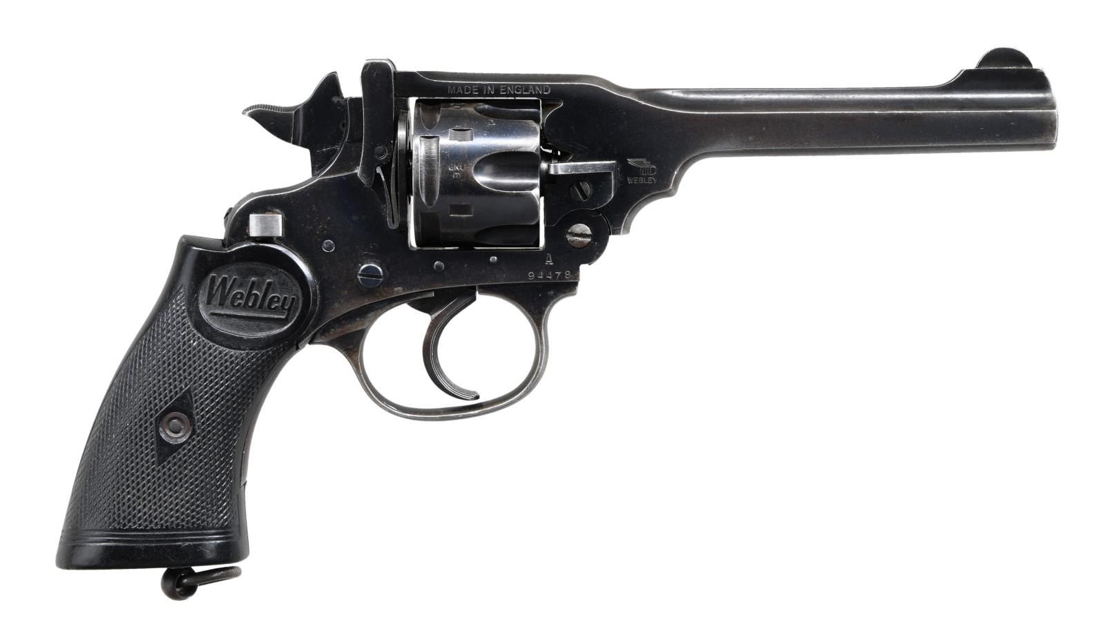 Cal. 38 S&W. S# A94478. Bbl. 5". Mfg. late 1943, w/ Import mark bottom of Bbl. & fitted w/ hammer block safety. Matching S#s on frame, butt & cylinder. Fixed blade front & notch rear sights. Six shot fluted cylinder, black checkered hard rubber grips & lanyard ring in butt. CONDITION: metal retains about 75% fading blue w/ light areas of fine pitting & the bulk of the finish loss on the gripstrap & bottom of the Bbl. Grips are worn w/ some texture to the checkering along w/ light chipping. Bore is very good, bright & strongly rifled. (23-1018/CW). CURIO. $300-500.
