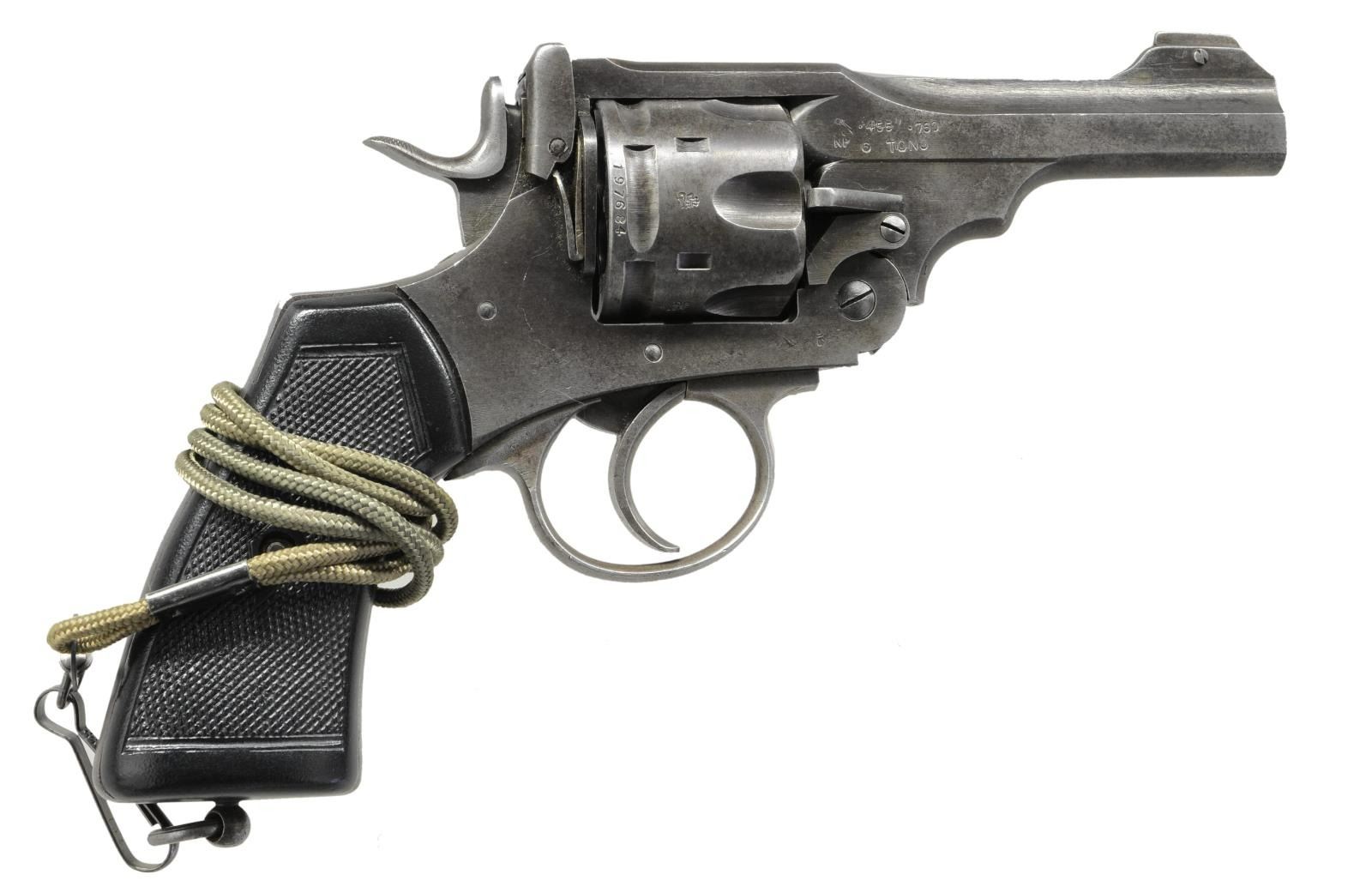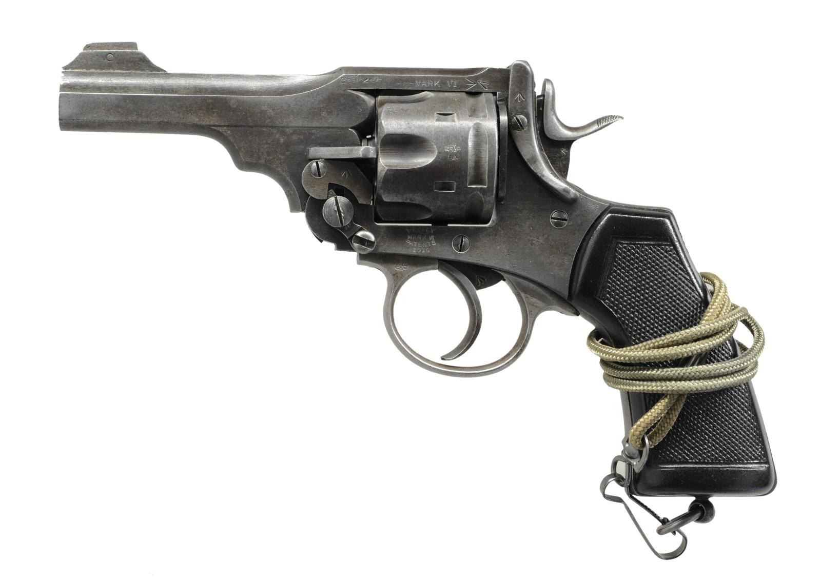 Cal. 455. S# 197684. Bbl. 4". Pinned blade front sight. Matching numbers on cylinder. Hard plastic checkered grips. Lanyard ring. CONDITION: overall fair void of finish with scattered handling marks & some minor shallow light pitting. Good bore with distinct rifling. (23-1880/ZAL). CURIO. $300-500.