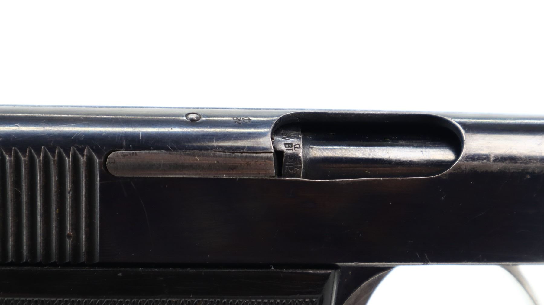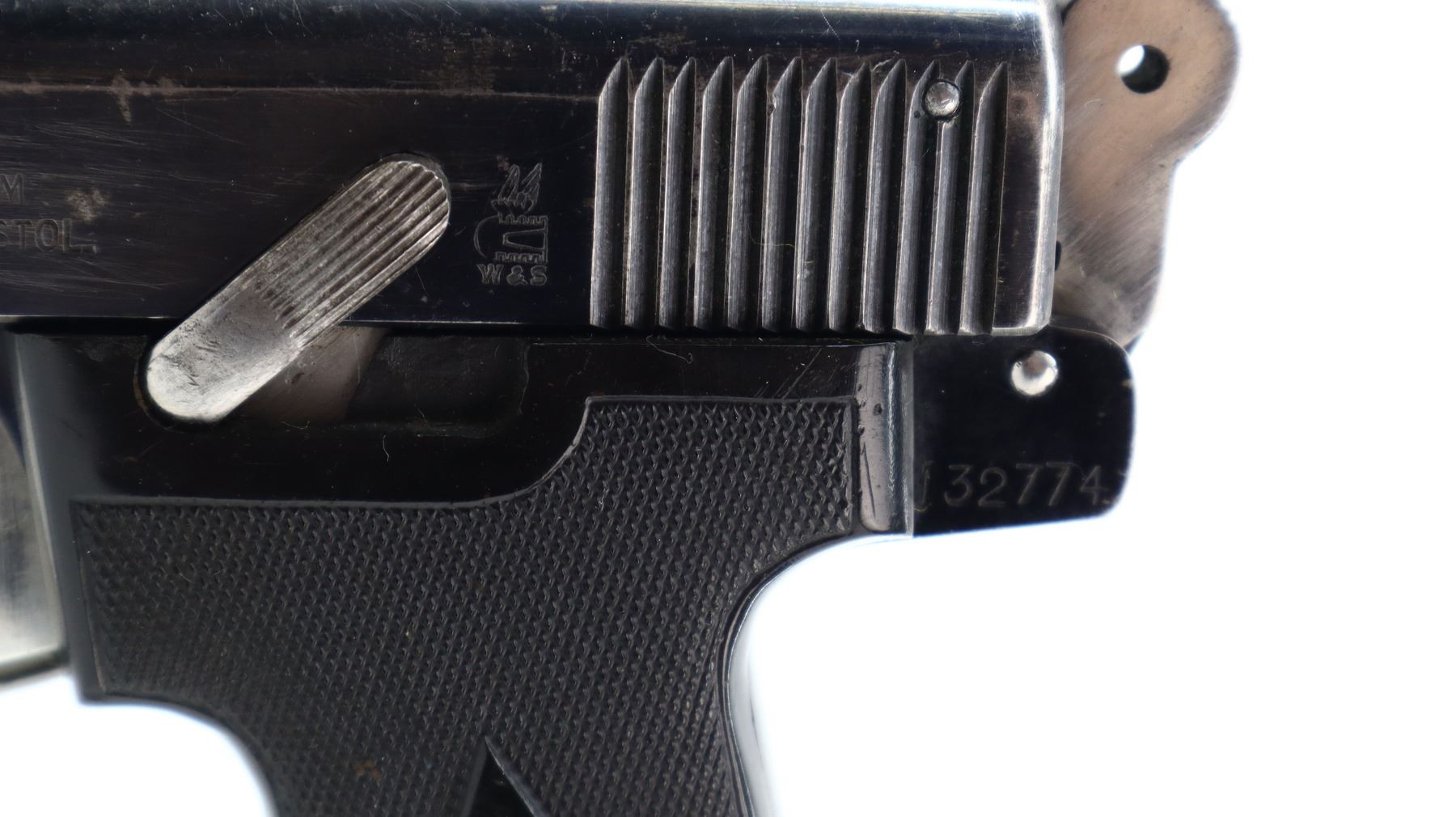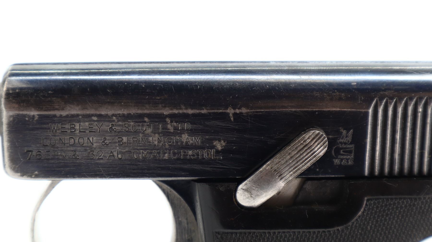 WEBLEY & SCOTT, MODEL: 1911 METROPOLITAN POLICE, CALIBER: 7.65MM, COMES WITH MAGAZINE, BORE IS FAIR, SLIGHT PITTING. BLADE FRONT SIGHT, FIXED U NOTCHED REAR SIGHT, BLUED FINISH, GROOVED ROUND HAMMER AND SMOOTH TRIGGER. TWO PIECE CHECKERED BLACK POLYMER GRIPS, HEEL MAG RELEASE, LARGE LANYARD LOOP. METAL FINISH SHOWS SOME SCRATCHES, HANDLING MARKS AND WEAR. GRIPS SHOW SOME MARKS AND SCRATCHES. , BARREL LENGTH: 89MM, ACTION: SEMI AUTOMATIC PISTOL, CONDTITION: 6/10, SERIAL # 132774, CLASS: CANADIAN 12-6 PROHIBITED