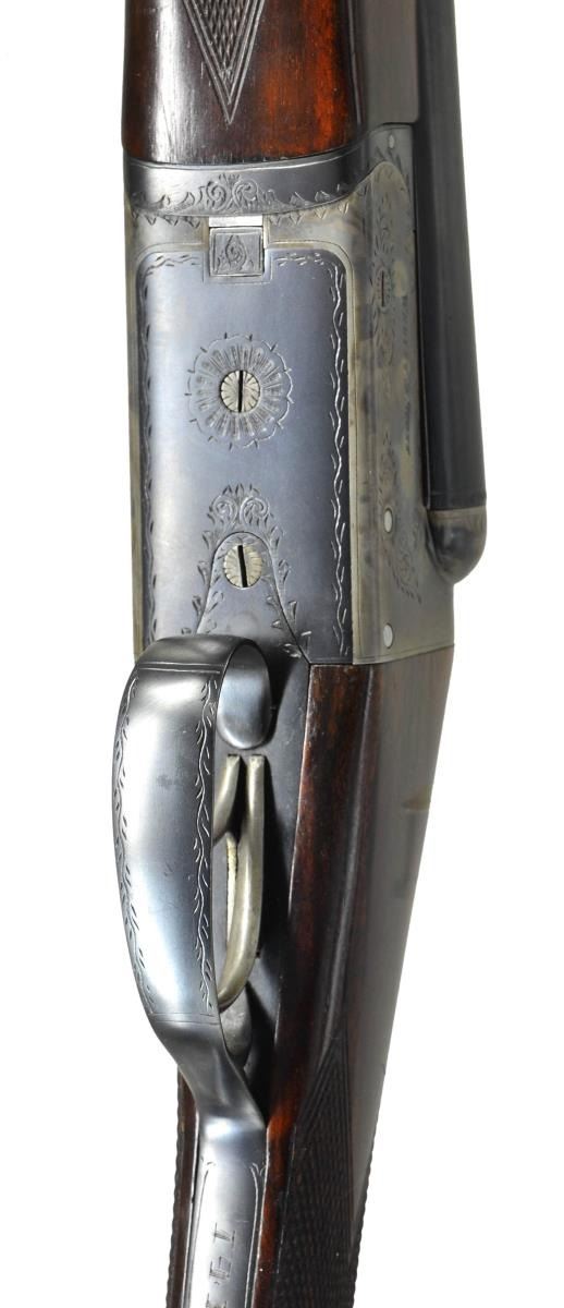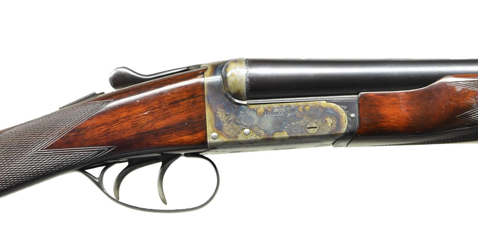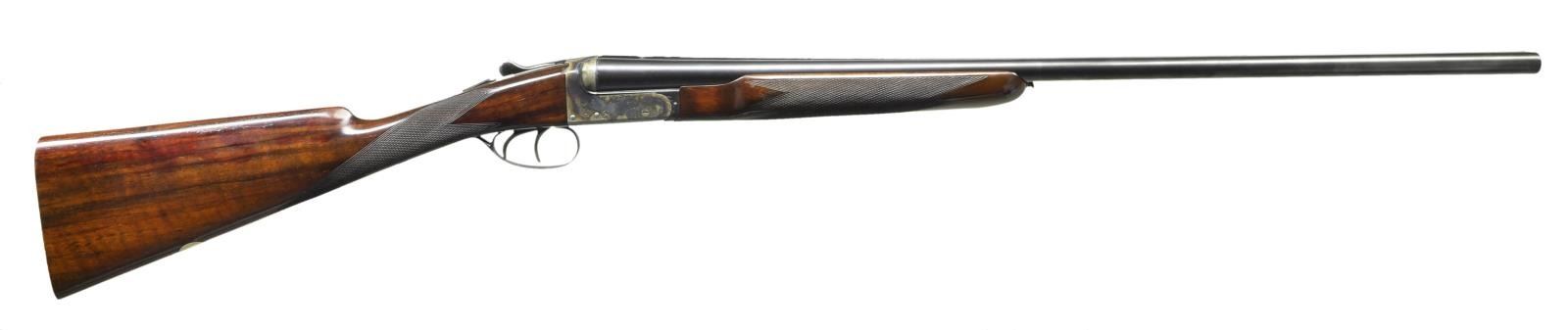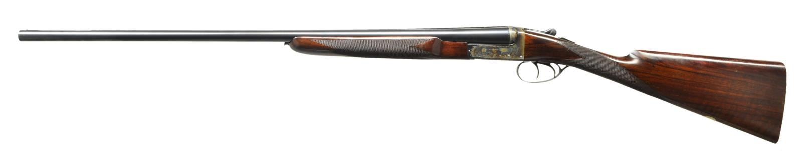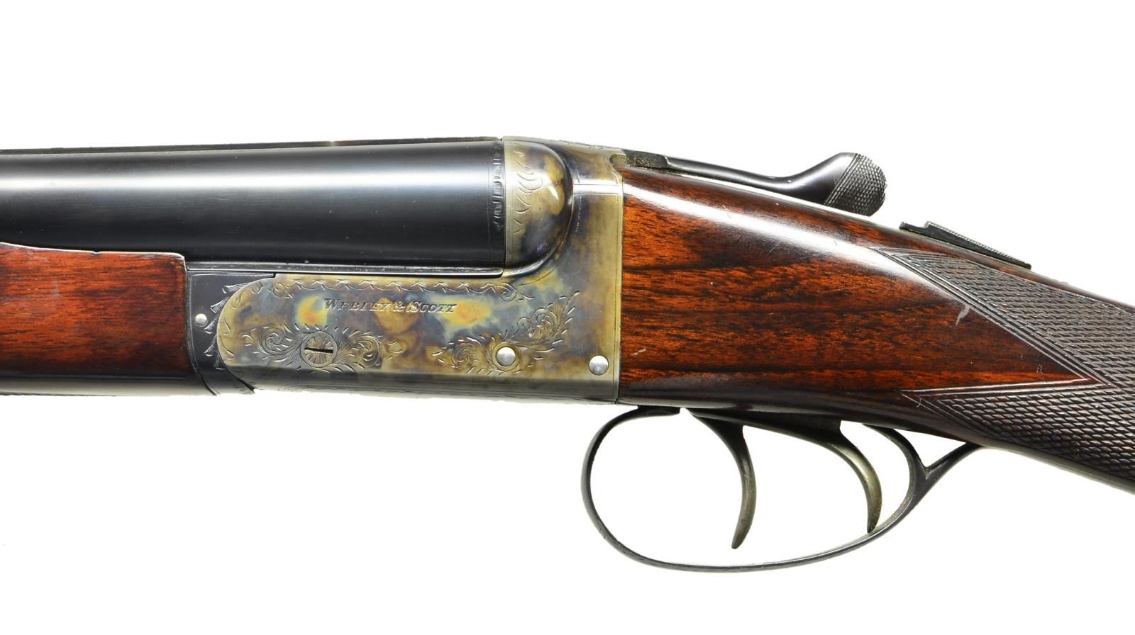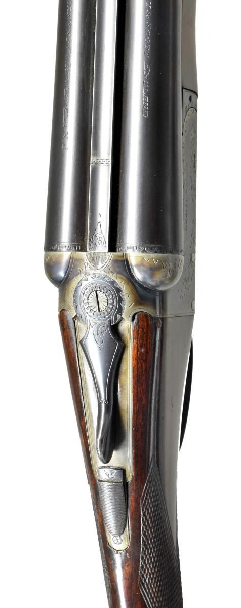 BEAVERTAIL GAMEGUN. Cal. 20 Ga. 3". S# 141086. The 28" dovetailed bbls. fitted w/ swamped game rib are engraved "Webley & Scott England" and "Service Armament Co. Ridgefield, N.J." on the tops (retailer). Bbl. flats are stamped with 1970 Birmingham nitro proofs for 3" chambers. Loop is stamped "MADE IN ENGLAND". Case-hardened boxlock action features automatic safety and dbl. triggers. Action is engraved w/ small sprays of scroll within line borders. "Webley & Scott" is stamped on both sides. Top lever, floorplate, triggerplate, and trigger guard are blued and have vine borders. Straight grip stock of streaked & lightly fiddle-figured European walnut measures 14 3/8" over serrated wood butt. Point pattern checkering is at grip, and a vacant silver oval is on the toeline. Matching long beavertail ejector forend has an Anson release. MEASUREMENTS: BBLS: Bore Diameter: R .618", L .620". Restriction: R .022" (MOD), L .028" (IMOD). Min. Wall Thickness: R .030", L .030". STOCK: DAH: 2 1/4". DAC: 1 1/2"; LOP: 14 3/8". CAST: very slightly off. WEIGHT: 6 lb., 3 oz. CONDITION: very fine, retaining over 95% of the original finish on bbl., action, & wood. Wood shows some light scuffs and a few marks, most notably a 1" patch of scuffing on the left side of the beavertail forend. Bores are bright & shiny. Action is tight. Mechanically fine. (22-2244/MGM). CURIO. $2,250-3,000.