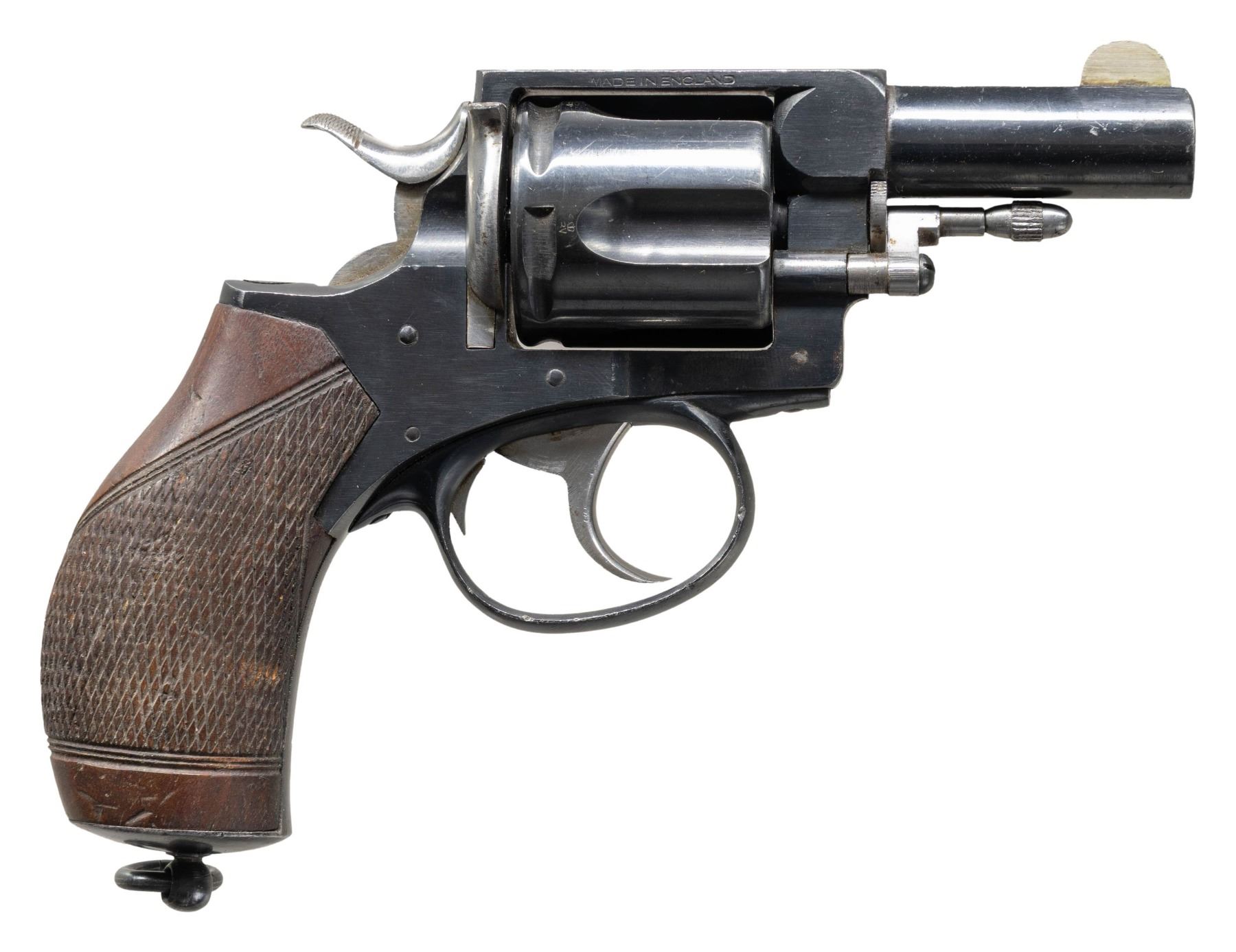 Cal. 455. S# 102553. Bbl. 2 9/16". R.I.C. M/83 double action revolver mfg. by Webley & Scott, likely in the late 1920s to the early 1930s. Left side of the top strap is stamped "WEBLEY & SCOTT LTD. BIRMINGHAM", with "MADE IN ENGLAND" marked on the right. Left side of the frame is marked "455", and "WEBLEY'S/ R.I.C/ MODEL /83/ 5 SHOT" above the Webley & Scott winged bullet logo and S#. Frame, cyl., and bbl. exhibit British proofs. Metal components exhibit a blue finish, with the cyl. base pin, ejector rod assembly, trigger, and hammer being polished in-the-white. Frame is mounted with a 1-piece checkered wood wrap around grip and features a lanyard swivel & ring on the butt. German silver half-moon blade front sight with frame notched rear sight. Cyl. and bbl. are matching via "553". Loading gate and ejector rod swivel are matching via "3". Cyl. base pin appears to be stamped "76". CONDITION: metal components retain the majority of their original factory blue finish, showing some light edge wear, some superficial handling marks, as well as some scattered spots of light surface oxidation and pitting. In-the-white parts show some small scattered spots of age related discoloration. Mirror bore, exhibiting some spots of hardened grease, while retaining well defined rifling throughout. Proper manual mechanics, although the hammer needs to be pulled completely rearward before locking in the cocked position. Grip shows scattered marks and impressions from handling and storage, but otherwise remains sound. (25-5062/MLW). CURIO. $400-600.