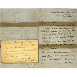 <b>879. DANIEL WEBSTER </b>(1782 - 1852) American lawyer and statesman who verbally jousted with Calhoun in the Senate and later supported Clay's compromise measures on slavery. A.L.S. 3pp. 8vo., Washington, June 12, 1849 to his wife Caroline, concerning family matters, the weather, some gossip, and so on. Webster rather snootily closes his letter<i>: "Mrs. Webster I hear nothing from home. This is not a day for Boston lettuce</i>". Old archival tape repairs to two folds on first page, otherwise overall very good. Sold with an 1878 A.N.S. of his wife <b>CAROLINE WEBSTER</b> sending a collector this letter. Two pieces.<b>$100-150</b>