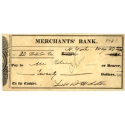 <b>880. DANIEL WEBSTER</b> Partly-printed D.S. 1p. 5 1/4" x 2 1/2", New York, May 29, 1843, a check made payable to "<i>Mr. Heter[?]</i>" for the amount of $20 drawn on the Merchant's Bank. Cancellation punches well clear of signature, very good condition.<b>$150-200</b>
