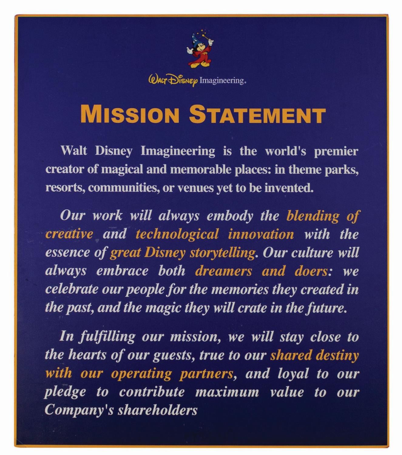 (WED, c.2000s) A WED Imagineering mission statement wall sign. The foam board sign proclaims the guiding principles of the Disney branch behind theme park wizardry and magic: "Our work will always embody the blending of creative and technological innovation with the essence of great Disney storytelling…" It retains velcro strips on the reverse from previous Disney display. Measuring 14.5"x12.5", the sign is in very good condition with minor surface scratches and scuffs.