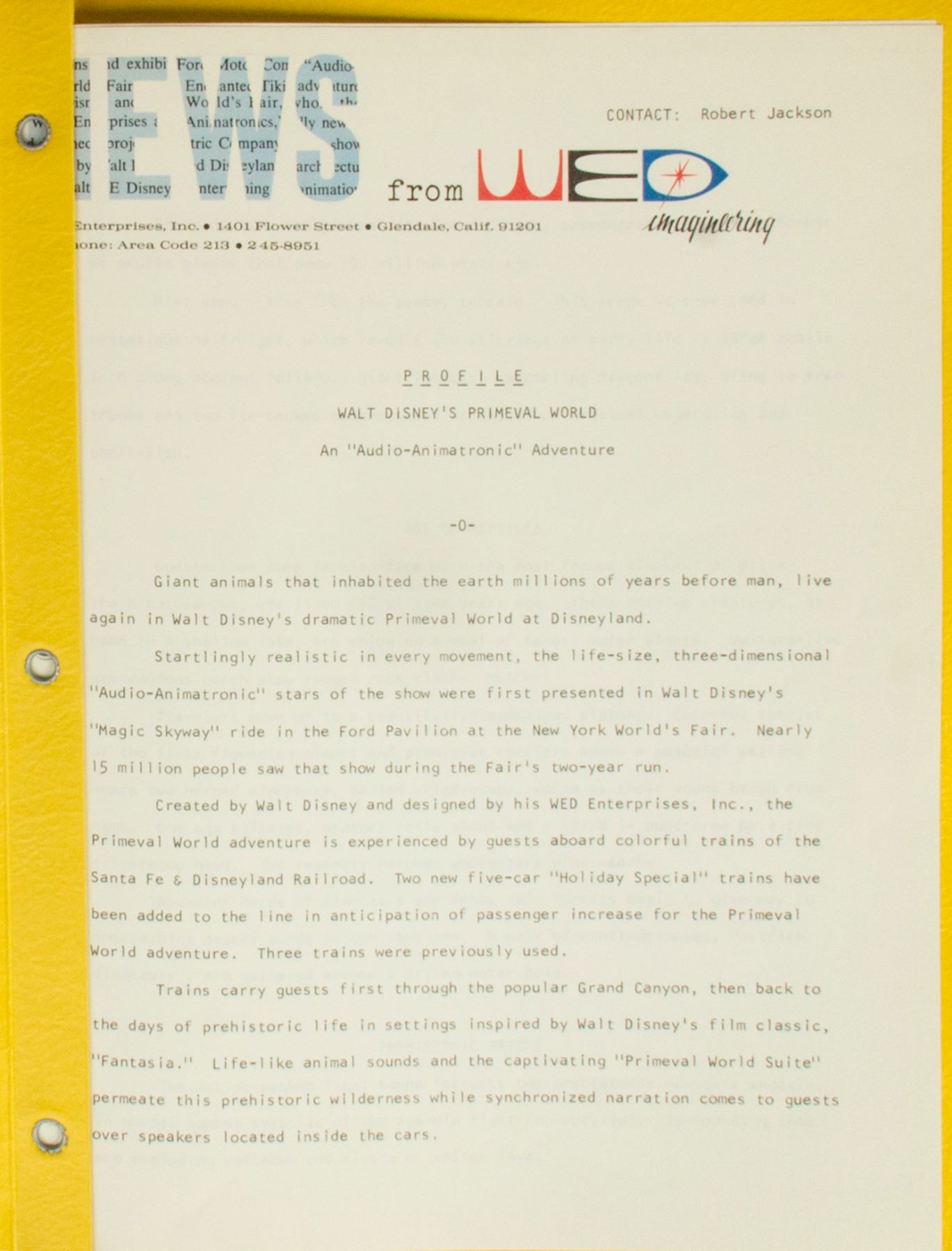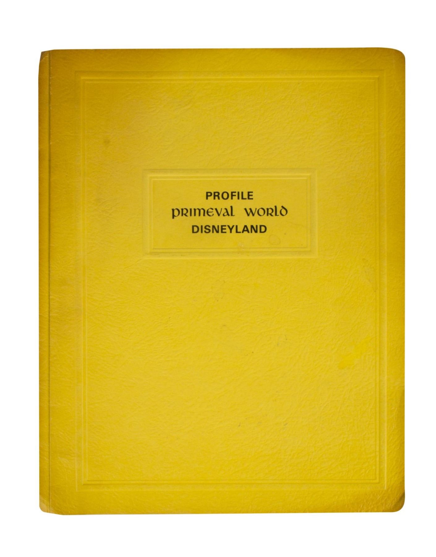 (Disneyland, 1966) A very rare profile summary packet prepared by WED Imagineering for the grand opening of the "Primeval World Diorama" as part of the Disneyland Railroad. This packet was created to highlight important aspects of this new Disneyland attraction. This 3-page packet provides some of the earliest information on the new attraction including scene descriptions, a summary of audio-animatronics, and the attraction's history at the World's Fair. Measuring 11.5"x9.25", the packet is in good condition overall with some wear to the cover and edges.