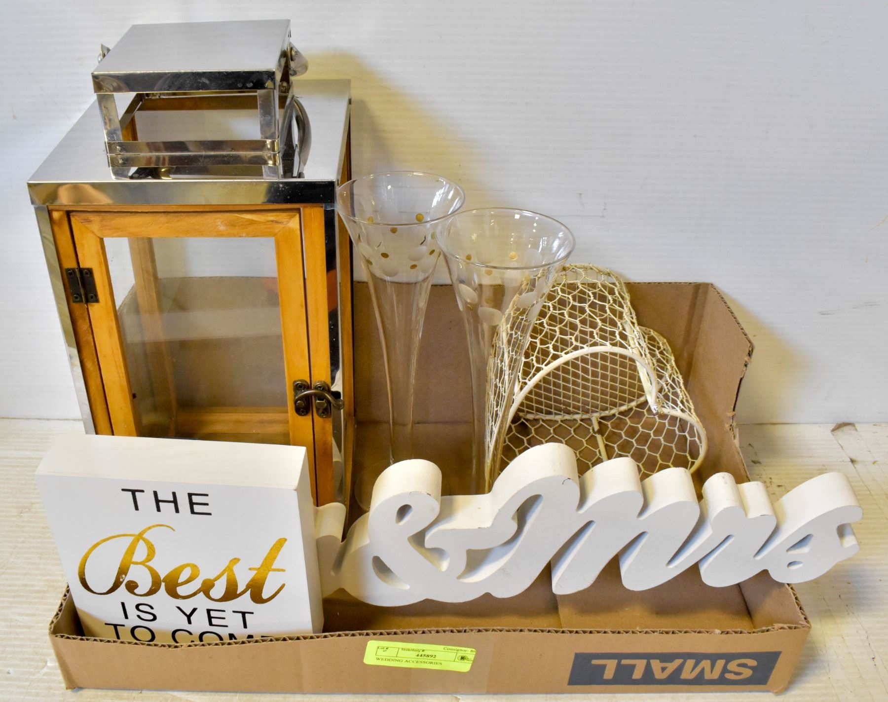 LANTERN (11.5" TALL); WOOD MR & MRS SIGN; THE BEST IS YET TO COME SIGN; MESH HEART BASKET; 2 CHAMPAGNE FLUTES