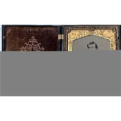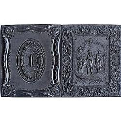 THESE NUMBERS IN PARENTHESES. CONTACT BE-HOLD FOR A SPECIAL PRICE ON THE NEW 2nd EDITION.] This has a geometric (3 – 4) back. ½ plate ambrotype in an unusual mat with the photographer’s address, “207 Bowery NY” inscribed at the bottom. Outside edges smooth & complete. When open, you see a small bite around the clip near the top of the cover. Upper hinge slightly loose. The cover is straight, but the back is warped, slightly bulging outward.