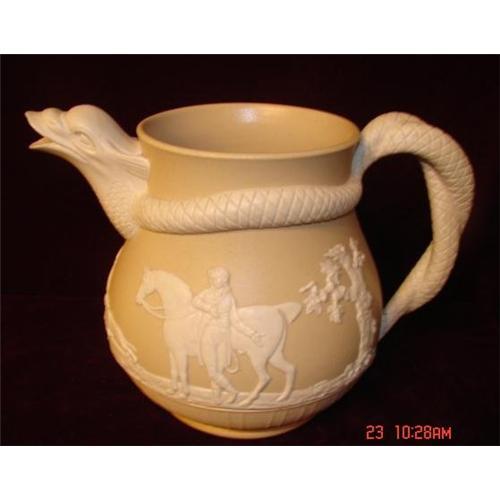 19TH Century Wedgewood Sand/Beige Jasperware unusual pitcher with Fox Hunters and Horses in a very unusual scene. Curvy Snake Handle wrapped around the top opening of this pitcher and adjoining a Eastern Shore Chesapeake Bay Bird. Also in the foxes and horse scene with the rider are mythological trees. On the bottom of the pitcher is a seal with the #15. From the top of the handle to the ocean bird spout measures 10". The height of the pitcher is 6 1/2".