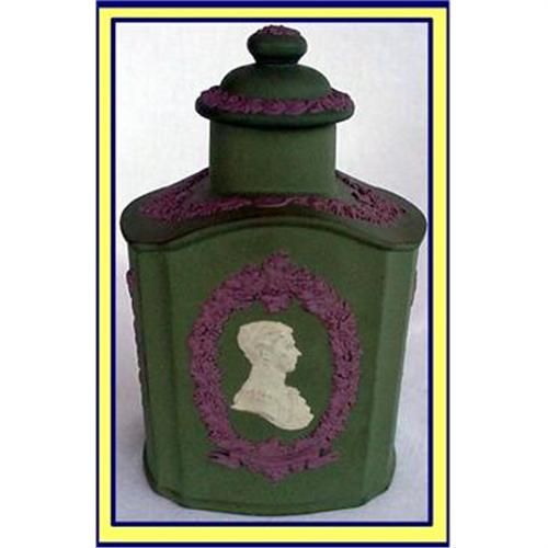Wedgwood tri color jasper teacaddy commemmorating the Royal Wedding of Prince Charles and<BR>Dianna.<BR>6 1/2inches high.<BR>Green jasper ground decorated with unusual teal coloured jasper vine leaves, grapes and flowers -<BR>incredibly fine and delicate. Within oval reserves on either side is a white jasper prtrait of the<BR>Royal couple - each shown in profile. A banner underneath each portrait proclaims ROYAL WEDDING and<BR>the date 1981.<BR>The teacaddy has impressed Wedgwood Made In England marks underneath. <BR>Excellent condition. No damage of any sort.
