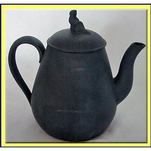 Wedgwood teapot with figural finial in black basalt, made England, early to mid 19th century.<BR>Measures 5 1/2inches high.<BR>Pear shaped, smoothe black basalt with unadorned surface. The only decoration is a fine figurine of a seated woman, serving as the finial on the lid.<BR>Marked underneath with impressed WEDGWOOD and CKZ. <BR>Excellent condition. No chips/cracks/damage of any sort.