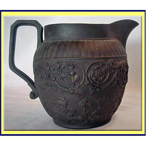 Wedgwood black basalt jug / pitcher depicting the emblems of the nations of the British Isles. England Scotland Wales Ireland. Made in England late 18th -early 19th century.<BR>Measures 4 1/2inches high.<BR>Classic form. Moulded in relief with scrolling foliage forming reserves containing the four National emblems of the British Isles: the clover, the thistle the rose and a lyre-playing angel (should this be a daffodil?) flanking a flowering plant in the center, under the spout. Below, is a band of beautifully moulded acanthus foliage and above is a band of gadrooning. <BR>Impressed marks underneath Wedgwood and 36.<BR>Excellent condition: no chips/cracks/damage of any sort.