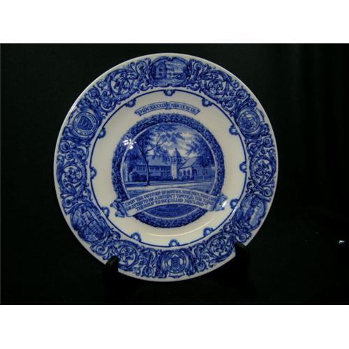 This is a beautiful blue and white transfer ware plate. It was made by Josiah Wedgwood & Sons, Etruria, England and Richard Briggs Co., Boston for the commemoration of the 250th anniversary of Incorporation of Malden, Mass. of 1899. The plate shows the roman numerals of MDCXXXIX - MDCCCXCIX (1649-1899) at the top in a banner. On the bottom is "Upon the petition of Mistick Side men, they are granted to be a distinct towne, & the name thereof to be called Mauldon" in the Commenwelth of Massachusetts. Mauldon is spelled differently on the back of the plate. The border of the plate is done in a very busy scroll work with several seals and pictures of the area. In addition to the Wedgwood and Briggs names printed in blue on the back, there are the impressed name of Wedgwood and two other that I assume are date stamps. The plate is in excellent condition with no chips, flakes or cracks.