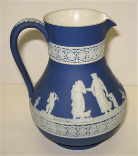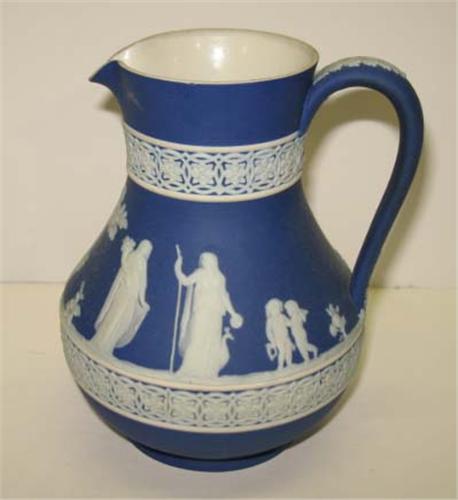 WEDGWOOD CREAMER. Jasperware. Decorated with cameo classical figures on dark blue background. Marked on bottom. 6” H