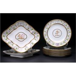 SERVICE, each pieced printed and painted in colours by J. Hodgkiss, E. Tatton or H. Beardmore, signed, with a central panel of a putto within a gilt band, the rim with ribbon-tied scrolling vines and grapes within gilt borders, comprising: