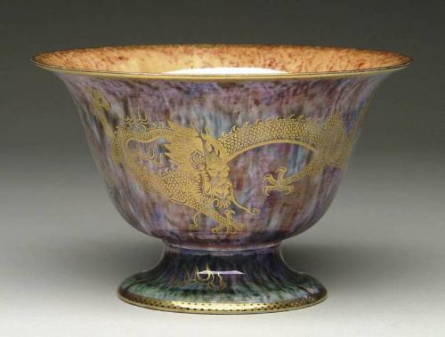 WEDGWOOD DRAGON LUSTRE BOWL. Wonderful dragon lustre bowl has interior ground of salmon color with mottled crimson over printing and gold decoration of dragons. Exterior of bowl has mottled ground of blue, green and brown lustre with gold dragons encircling the bowl. Foot and rim are trimmed with a gold geometric checkerboard design. Signed on the underside “Wedgwood England Z4823”. SIZE: 8-3/4” dia x 5-3/4” t. CONDITION: Small light scuff mark to 1/2” area on interior of bowl, otherwise very good to excellent. 5-62594