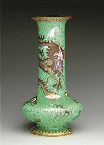 WEDGWOOD DRAGON LUSTRE VASE. Wonderful Wedgwood vase has green mottled background with a beautifully detailed golden dragon encircling the vase. Dragons face and body are highlighted with blue and lilac coloration. Signed on the underside with Portland vase mark, "Wedgwood", "Made in England". SIZE: 11-1/4 in. t. CONDITION: Very good to excellent. 5-61253