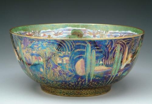 WEDGWOOD FAIRYLAND LUSTRE BOWL. Outstanding Imperial bowl is decorated with Poplar Tree pattern on the exterior and Woodland Bridge on the interior. Marked on the bottom with Portland vase, "Wedgwood", "Made in England" and pattern "Z4968". SIZE: 10-1/2 in. dia x 4-3/4 in. t. CONDITION: Very good to excellent. 5-60258