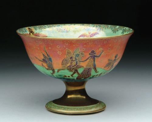 WEDGWOOD FAIRYLAND LUSTRE COMPOTE. Outstanding Fairyland Lustre compote is decorated in Elves on a Branch pattern. Exterior of compote is decorated with orange sky, green foreground with mushrooms and brown fairies. Interior of bowl is decorated with shaded green background, center with elves on a branch with flying elves, butterflies and bats circling. Marked on underside with Portland vase mark, "Wedgwood", "Made in England" as well as pattern "Z5360" with a "9" below. SIZE: 4-3/4 in. dia x 3-1/4 in. t. CONDITION: Very good to excellent. 5-60254