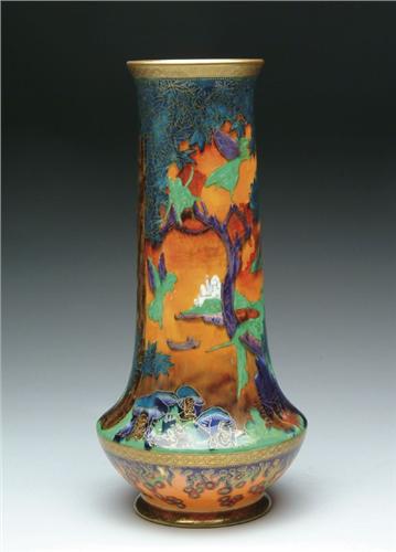 WEDGWOOD FAIRYLAND LUSTRE VASE. Wonderful Fairyland Lustre vase shape 2033 is done in Ship and Tree pattern. Decoration has flame lustre background with brown and purple tree trunks, green fairies with mushrooms in the foreground, a ship in the water visible from between the trees and buildings in the background. Signed on the bottom with Portland vase, "Wedgwood" and "Made in England". SIZE: 12 in. t. CONDITION: Very good to excellent. 5-60256