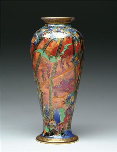 WEDGWOOD FAIRYLAND LUSTRE VASE. Wonderful Imps on a Bridge, pattern Z5360 on vase shape 3148 has beautiful flame lustre background with Imps in red shaded with violet. Boy in the foreground is brown with green wings spotted with orange while Roc bird is done in green. Signed on the bottom with gold Portland vase, "Wedgwood", "Made in England" with the pattern number. SIZE: 10-1/2 in. t. CONDITION: Some minor wear to gold trim on inside of lip, otherwise very good to excellent. 5-60255
