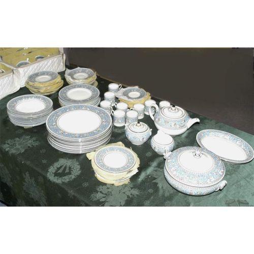 WEDGWOOD FLORENTINE PARTIAL DINNER SERVICE, Model #2614, turquoise, brown & black. Consisting of 13 dinner plates, 9 salad plates, 9 soup bowls, 9 demitasse cups and saucers, 8 teacups and saucers, 9 two handle soup bowls with saucers, 10 bread plates, teapot, creamer, sugar, covered casserole and oval serving bowl. CONDITION REPORT: no problems found. This lot will be expensive to ship and cannot be shipped by the auction house. Shipping will be through the UPS STORE and will cost approximately $250-$300 to ship depending on the final destination.