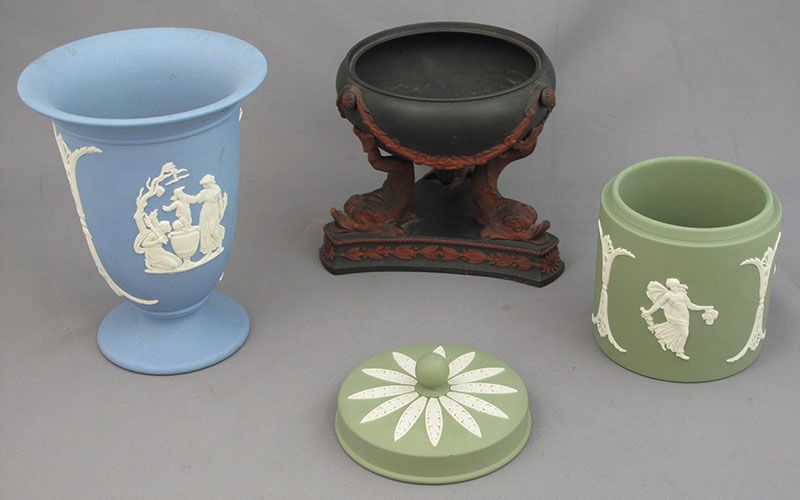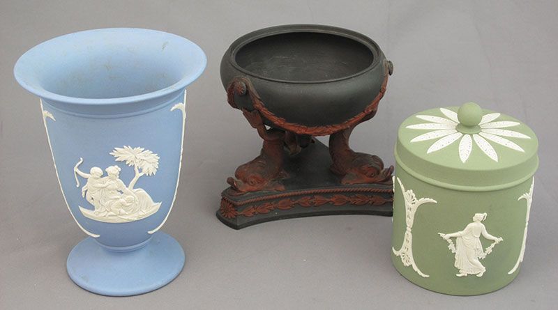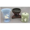 -comprised of a green Jasperware lidded pot, a blue Jasperware flared vase, and black and red incense burner with dolphin form supports (top missing).