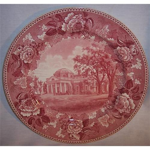 10'' WEDGWOOD COMMEMORATIVE/HISTORICAL PLATE IN PINK TRANSFER OF MONTICELLO,HOME OF THOMAS JEFFERSON.MARKED AS SHOWN.EXCELLENT COND.W/LIGHT OVERALL CRAZING,LIGHT SCRATCHES AND SOME DISCOLORATION ON BACK.SHIPPING WT.3 LBS.