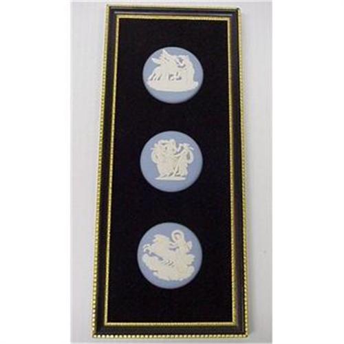 BEAUTIFUL FRAMED PICTURE, CONTAINING 3 BLUE WEDGWOOD - JASPERWARE MEDALLIONS ATTACHED TO BLACK VELVET,THE PICTURE MEASURES 10" X 4 1/4", AND EACH MEDALLION 1 3/4" in diam.US BUYER TO PAY 9.50 FOR SHIPPING PLUS INSURANCE.THANK YOU!