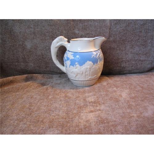 WEDGWOOD DYE KEN JOHN PEEL 1829 PITCHER DEPICTING A HIGH RELIEF HUNT SCENE. THE TOP IS SKY BLUE WITH BLACK TRIM AGAINST A CREAM COLORED BACKGROUND. THE HANDLE IS A FIGURAL MOLDED HOUND.