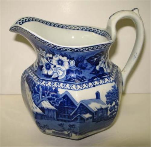WEDGWOOD BLUE DECORATED PITCHER. (1930s+). Decorated with cabin scene with deer. Marked on bottom “Fallow Deer”. 6.25” H