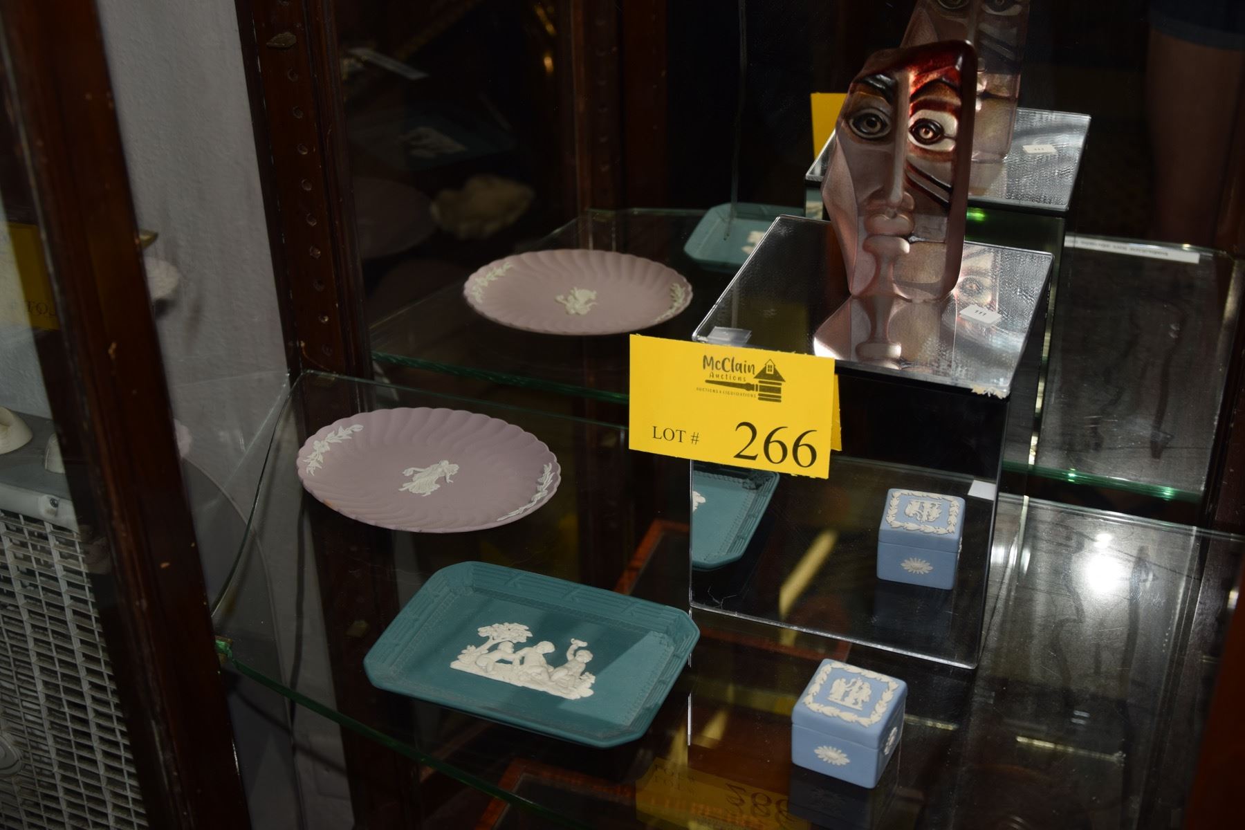 WEDGWOOD PLATES, WEDGWOOD BOX & FIGURAL ART GLASS; SIGNED & NUMBERED 65/103 (4 PCS)