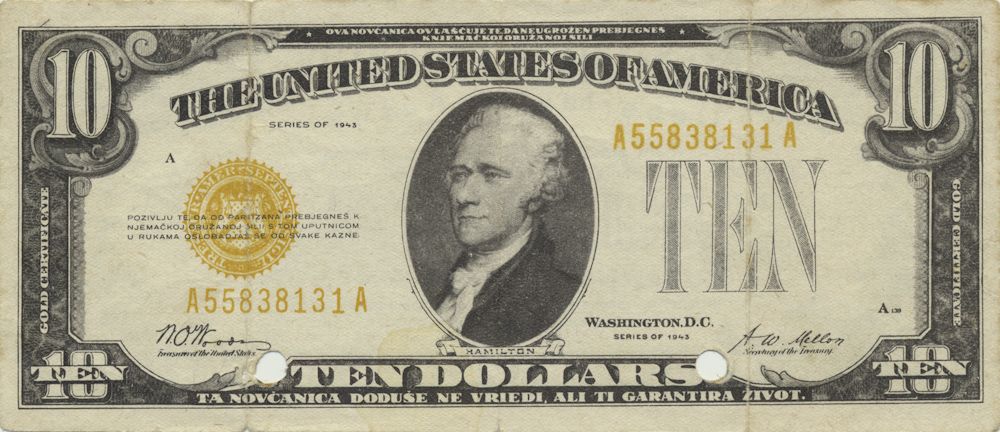 Scarce anti-Yugoslav partisan propaganda and safe conduct pass, a copy of a Series 1943 U.S. ten dollar bill bearing the legend at bottom in a Slavic tongue: "This bill is no good, but you are guaranteed your life". The verso, printed in German, Slavic and Russian, bears a eagle and swastika emblem with "safe conduct" language: "Don't shoot - but take this to the next German encampment and get a good deal". Two file holes, else very good.