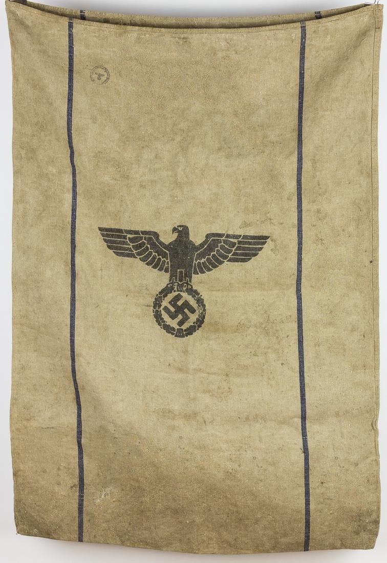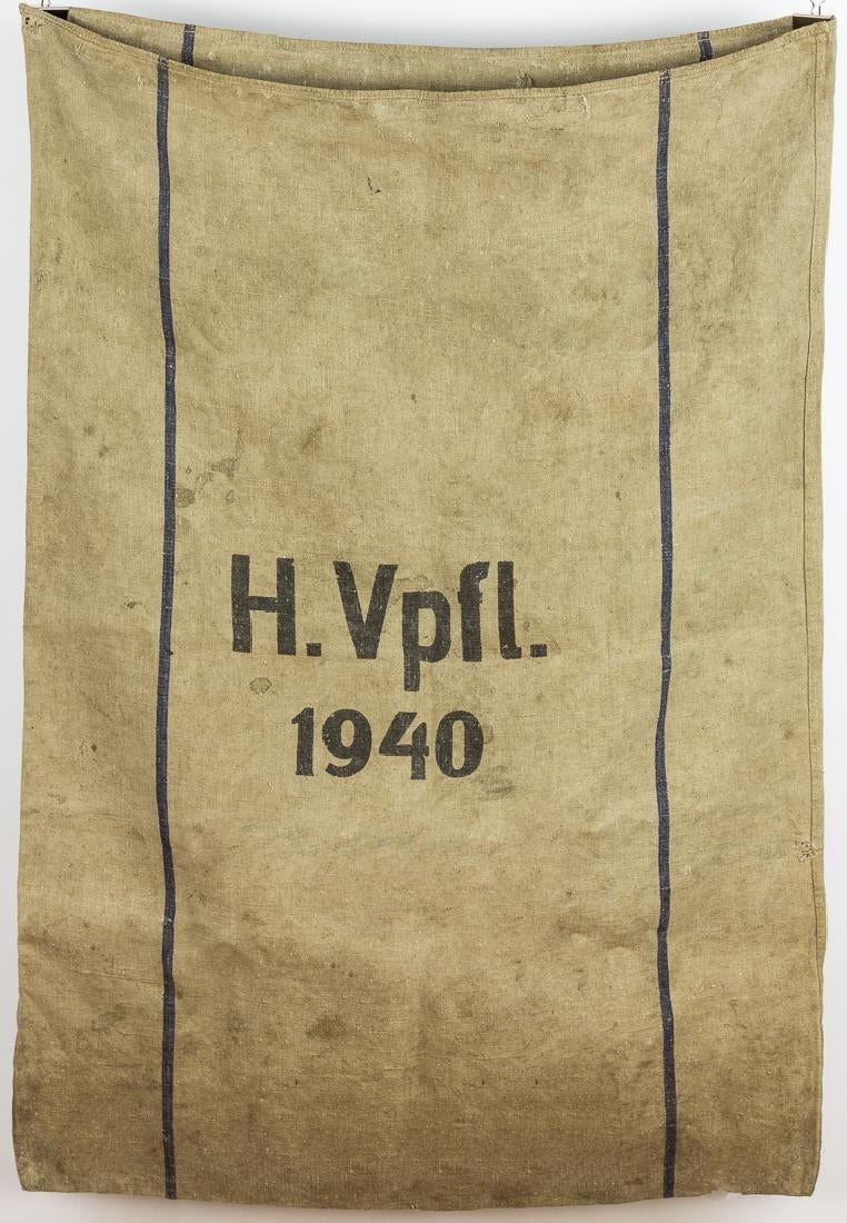 An original woven sack, 40x26 inches, used by the Wehrmacht to transport grain, mail, and other similar supplies in large quantities. The sack is stamped with an NSDAP national eagle in black ink on one side, and the abbreviation "H. Vpfl", for "Heeres-Verpflegung" ("Army Supply Service"), on the other, with the date "1940".