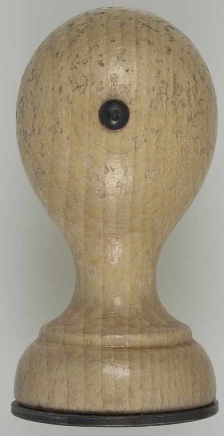 Wehrmacht unit's circular metal handstamp with wording : "Wehermacht einsheit 18570" encircling a Nazi eagle and swastika device at center. The seal is affixed by two screws to a 3" wood handle. Very good.