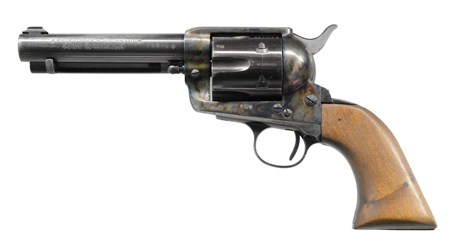 Cal. 357 mag. S# P5915. Bbl. 5" with a dove-tailed replacement Lyman white bead front sight. Mfg. in Germany & imported by FIE. Blued barrel, cylinder & straps. Case-colored frame. Smooth 1-piece walnut grips. CONDITION: overall good with thinning finish at muzzle, front strap & on barrel. Good grips with a repair at the bottom of right side. Very good bore. MODERN. (23-1885/ZAL). $300-500.