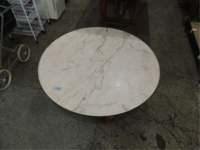 ANTIQUE VINTAGE MARBLE TOP COFFEE TABLE WITH ITALIAN MARBLE TOP. WEIMAN FURNITURE COMPANY OF ROCKFORD, IL. 16" TALL, AND 40" IN DIAMETER. AS SHOWN. SEE PICTURES FOR DETAILS.