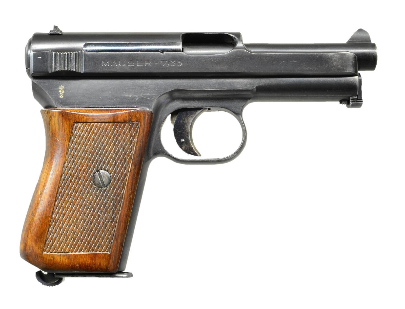 Cal. 7.65mm (32 ACP). S# 287269. Bbl. 3 3/8". Matching bbl., sideplate & slide. Right & left rear of frame both marked w/ Weimar eagle over "46" & "2". The back of the slide has an Imperial acceptance crown U marking. Left side of slide is marked w/ Mauser Oberndorf markings & "GERMANY" marking. Checkered walnut grips. Right bbl. lug is marked w/ crown over "U" proof. MAGS: 1-8 rd marked w/ Mauser banner on baseplate. CONDITION: grips show a scratch on left panel & a few dings. Metal retains 90% arsenal rework blue w/ thinning fire blue on trigger, a couple spots of light oxidation & some light freckling. Bore shows a couple rings towards chamber & some frosting. (22-3055/MJC). CURIO. $800-1,200.