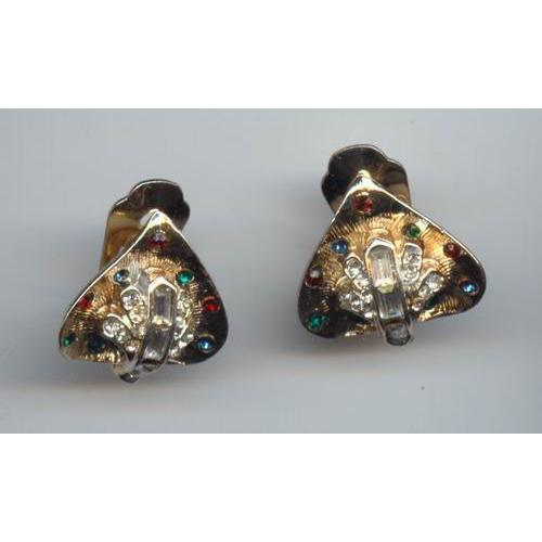 These lovely clip style earrings from WEISS are in MINT condition and measure 1 inch tall. They are shiny goldtone metal inset with multi-color rhinestones. They are signed, WEISS, on the back.