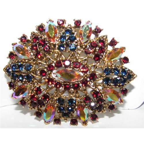 Fabulous Fifties! Multi-Color Sparkling Rhinestone & Austrian Crystal Pin/Brooch from WEISS will be a dazzling addition to your Vintage Jewelry Collection! Substantial Pin boasts Aurora Borealis Finished Navettes, surrounded by glistening Red crystals separated by "leaves" of multiple Blue Rhinestones in a Gold-plated Filigree setting. Dazzling! This pin is signed WEISS in the middle of the back. The pin portion is a little "spongy", however, the mechanism works very well. This Pin is in Excellent condition with no loose or missing stones. A Pin-to-Pendant converter is included (FREE) with this beautiful pin, so that you can wear it attached to a chain or necklace of your choice, in addition to wearing as a pin! Shipping price quoted is for USPS First Class Mail with Required Insurance. International shipping quote will depend on your location.
