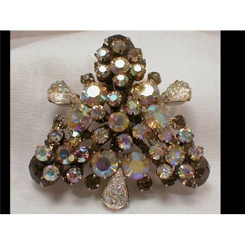 This is for a tremendous THICK layered brooch with not only a multitude of odd shaped prong set stones but also these molded glass opals color teardrops. The stones all have so much fire in them. This is made in layers to create this heavenly dimension that makes it looks like it is more than one brooch. The size is 2 ½ x 2 ½" and it is really heavy (34 grams) . There are thee smoky topaz color faceted glass stones on the corners which really bring out the fire in the stones above them. This is in great shape . Not signed but I had the earrings to match that were signed and they were sold previous to me finding this in the wrong box.