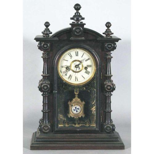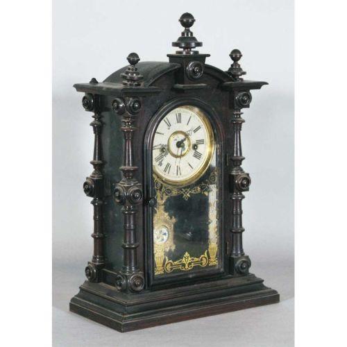 1 WELCH PATTI V.P. MANTLE CLOCK 18 1/2" high late 19th century CONDITION REPORT: paint loss to face. PACKING AND SHIPPING (excluding insurance) by Fairfield Auction to points within the Continental U.S.A. and Canada (all other international must be handled by 3rd party shipper) $30.