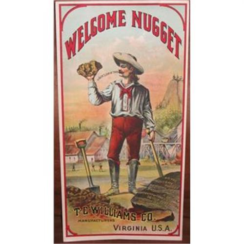 WELCOME NUGGET TOBACCO LABEL --- 1880?s, 7" X 14", gold miner with pick & shovel admiring huge nugget