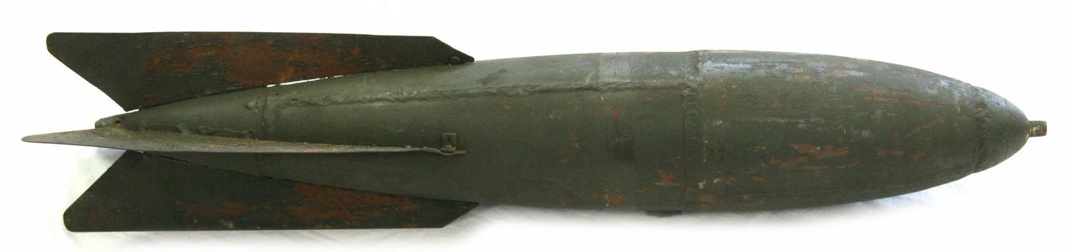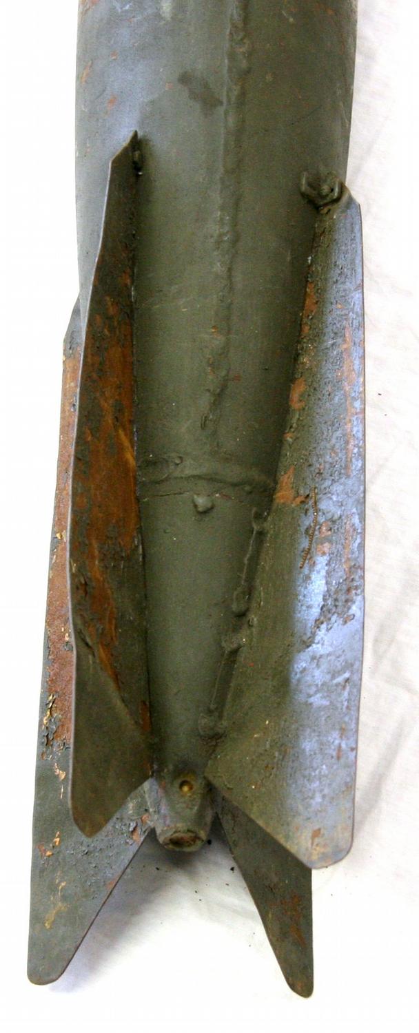 Welded steel inert aerial practice dummy bomb. Appears to be circa WWI. Measures approximately 38 inches. Weighs about 20 lbs.