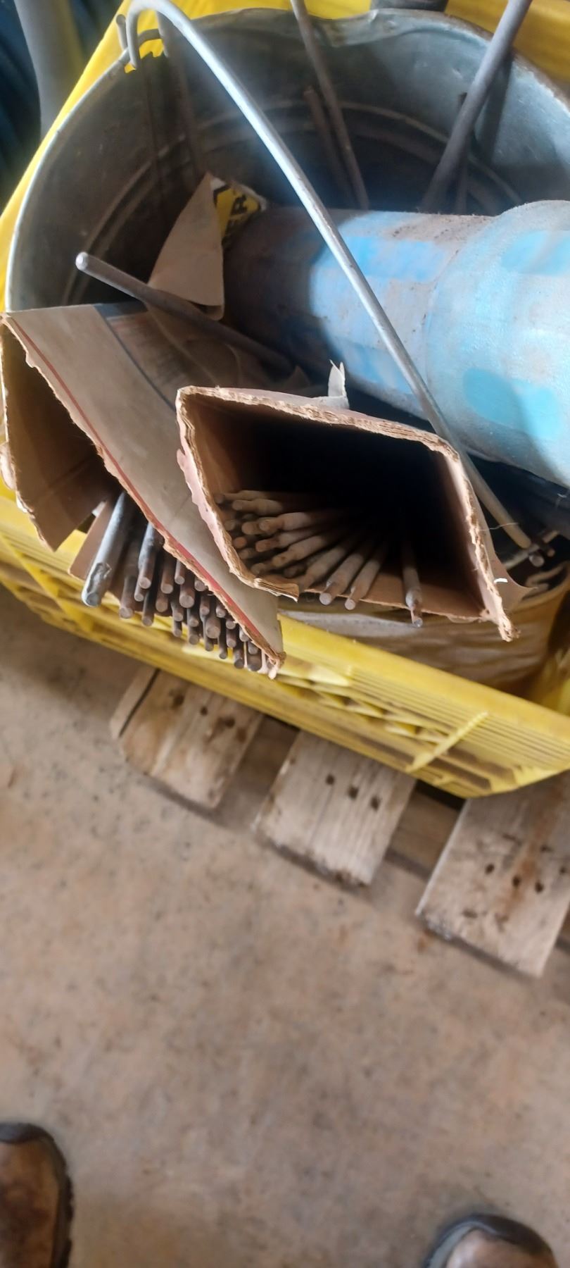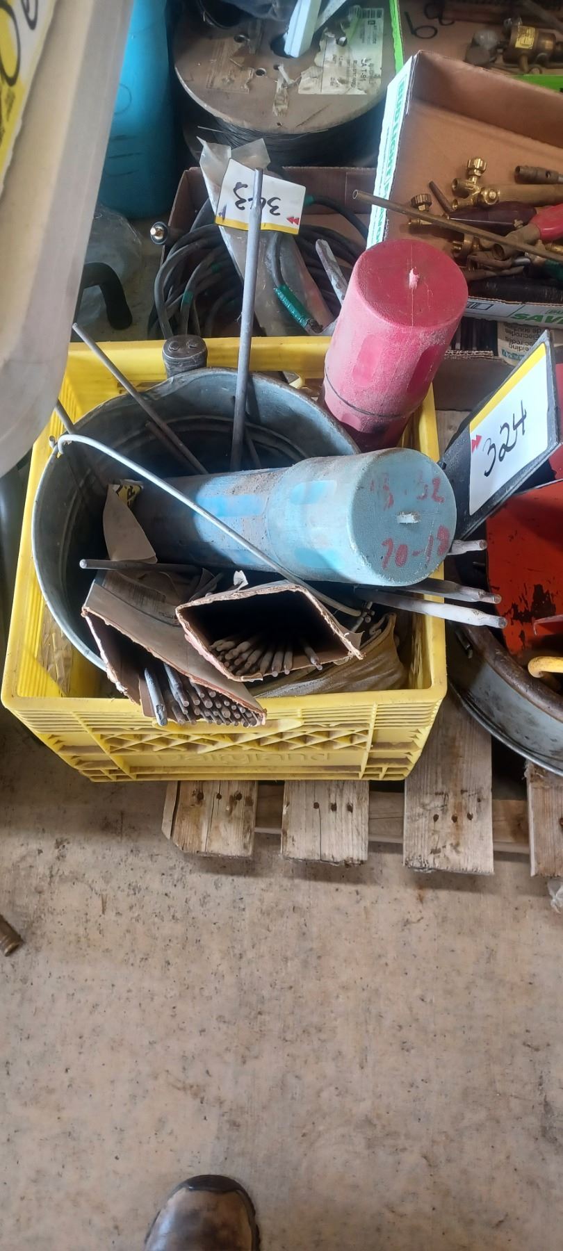 WELDING RODS. GLOVES, PLATES AND MISC IN IN MILK CRATE