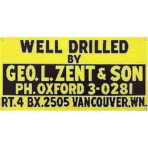 GEO. ZENT & SONS WELL DRILLED METAL SIGN -- 1950?s, 12? x 24?, tin sign, black text on bright yellow, from Vancouver, Washington